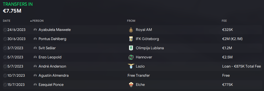 After initially struggling to find anyone, we took in eight new players. My €4m budget was offset with the departure of nine departures that raked in an additional €6.75m. In total, I spent €9.5m.