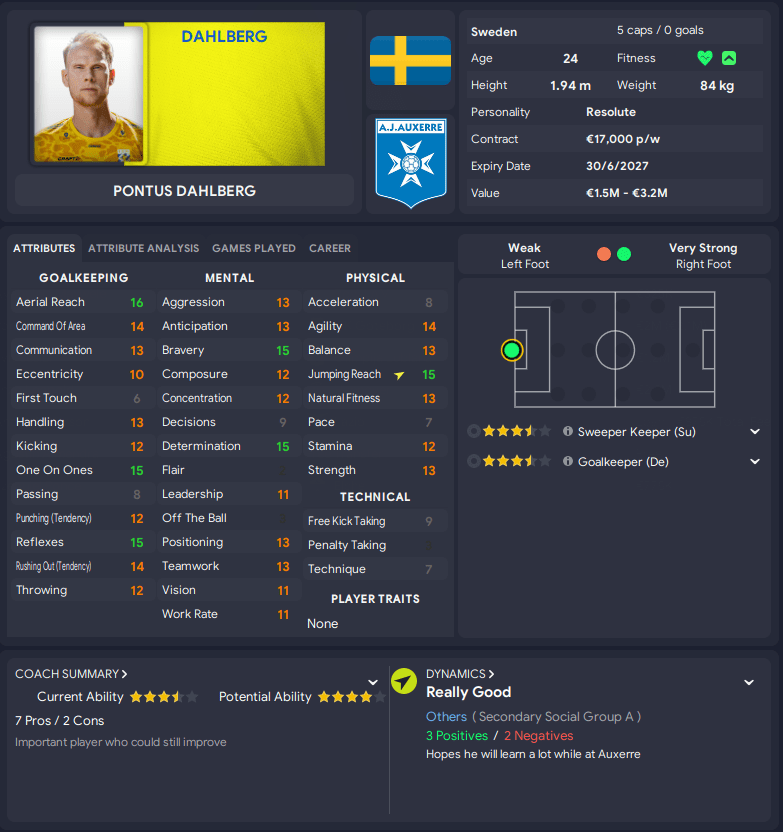 Pontus Dahlberg isn’t an outstanding goalkeeper, but he is strong in all of the areas I deem important. He was one of my more expensive signings, but he’s added a lot of quality at the back. I think he’ll be here for a few years before I look to upgrade. It might be longer depending how he does. He’s only 24, so in goalkeeping terms, he’s very young.